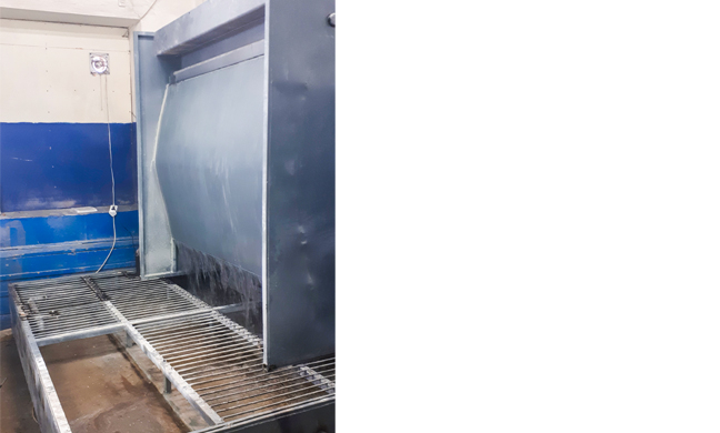 Отличное решение для ликвидации пыли в производственном цехе, уменьшения запаха, снижения вредных факторов. Рабочий свободно передвигается по решетке над ванной. Водная завеса защищает работника от аэрозолей и паров растворителя.